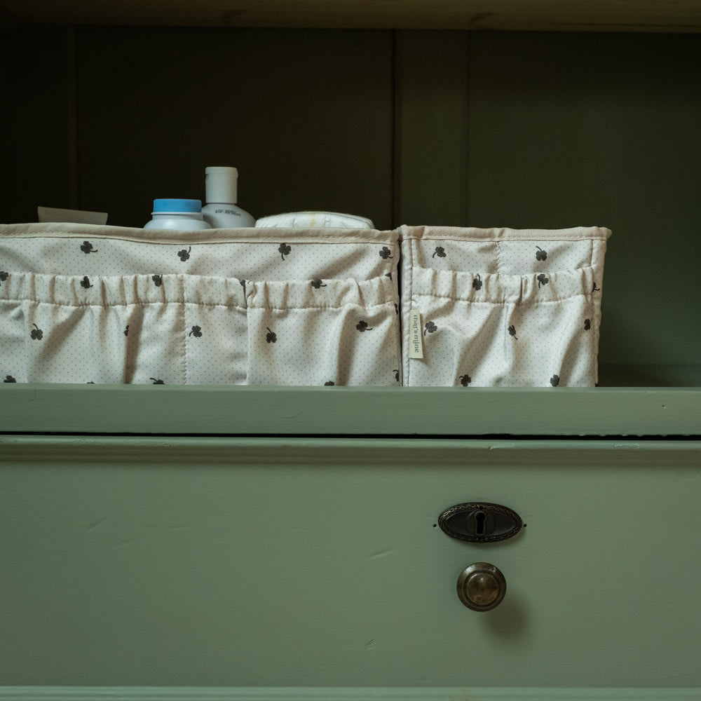 The changing storage box makes it easy to organize the things you need during changing time. The box is perfect for storing diapers, creams, cloth diapers and other changing essentials. The storage box consists of one large compartment with removable dividers - with a practical Velcro closure, so you can decide whether you want one large compartment or three smaller compartments. The storage box has practical pockets, one large and two small ones. When you're not using the box and want to save space, you can open the bottomt and fold it up.